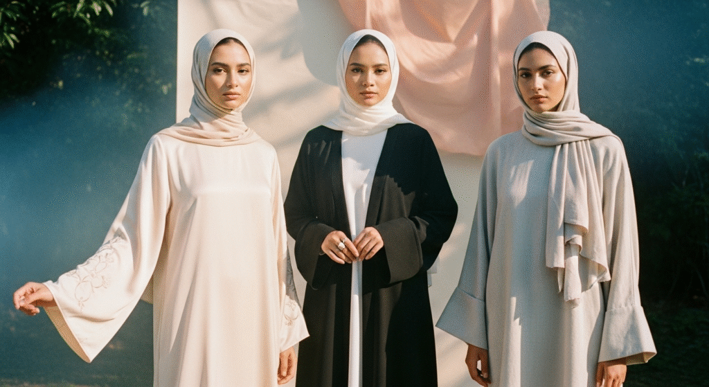 Abaya tetap jadi pilihan utama, namun dengan konsep monokrom dan tailoring rapi. Banyak brand lokal menggabungkan abaya dengan outer blazer panjang — menciptakan tampilan elegan untuk acara formal maupun kantor.