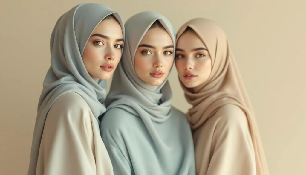 Menurut riset WGSN & Muslim Fashion Trend 2025, palet warna tahun ini berfokus pada kombinasi netral lembut + aksen pastel kontras.