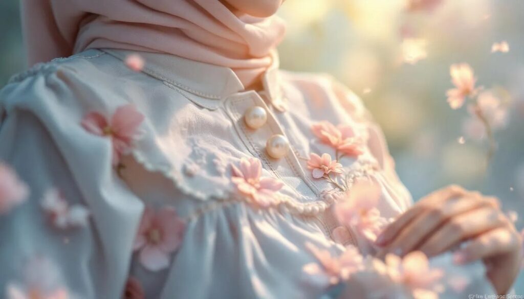 Gamis klasik kini tampil lebih segar dengan potongan asimetris, detail drapery, serta permainan layer dan material ringan seperti linen premium atau satin matte. Warna yang dominan antara lain champagne beige, sage green, dan dusty lilac.